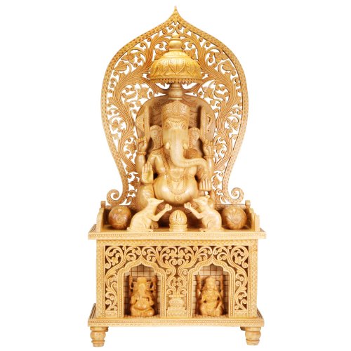 Lord Ganesha is believed to bless us with luck, wisdom, success and wealth. He removes obstacles and liberates us from desires. Amongst the scores of Gods in the Hindu pantheon, Ganesha is given prime importance. It is common practice to invoke Lord Ganesha before starting anything new or important. In Hinduism, Gods and Goddess are worshipped individually and in combinations, especially during certain festivals. One such combination is that of Ganesh-Lakshmi (Laxmi). Success in business, wealth, prosperity in family, Ganesh-Lakshmi reside over some of the most important aspects of our daily lives. Rich in symbolism, this Ganesh sculpture depicts a large Ganesha, and one small Ganesha and Lakshmi. From a carved parasol, indicating Gods supremacy, to mouse representing control over our desires, each inch of this hand-crafted Ganesh sculpture evokes a positive energy. This sculpture is not just a Ganesh statue, but a temple for your home. Measuring 24 inches in height and 12 inches in width, enjoy free shipping on this statue. Handmade, minor variations and organic defects makes your Ganesh unique. Read more...