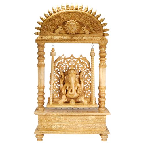 There's more than one version of Ganesha's beginnings. The best-known tale, from the text of the Shiva Purana, has his mother, Parvati, fashioning him as a beautiful little boy out of a lump of sandalwood paste. Parvati, you see, was bored and lonely, as her husband, the mighty god Shiva (a.k.a. the Destroyer of Worlds) would often forsake her for lengthy, million-year stints, meditating in the wilds. So what better company than a child for her to nurture and play with? Thus he is often depicted in child-like and friendly postures. Resembling the look of the sandalwood, this Kadam wood Ganesh art-piece is handcrafted. Every inch has intricate detailing, depicting elements such as peacocks, Sun God, flowers, leaves etc. The Ganesha is depicted seated on a swing which is suspended using hooks. This large Ganesh statue measures 24 inches in height. Handmade, minor variations and organic characters of the wood makes your Ganesha truly unique. Read more...