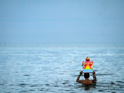 0 Response to "A Devotee Immerses the Idol of Elephant-Headed Hindu God Ganesh Photographic Poster Print, 42x56"