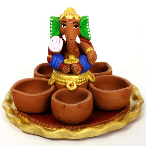 Ganesha, a Hindu God with the head of an elephant, is the divine giver of blessings and protection. Commonly used as part of most Hindu ceremonies, this Ganesha is made of Terra-cotta and has a Ganesh statue surrounded by 5 Diya cups. Handmade, it measure about 5 inches in height. Read more...
